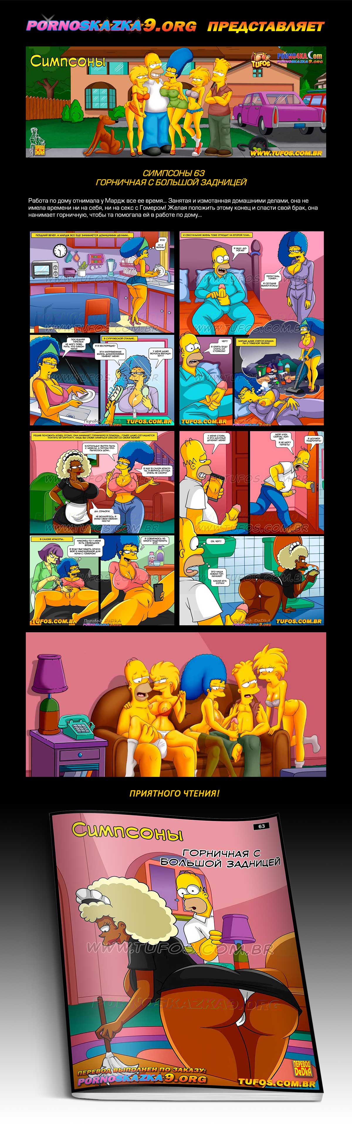 Порно комикс «Симпсоны. Часть 63. Горничная с большой задницей.» Работа по дому отнимала у Мардж все ее время… Занятая и измотанная домашними делами, она не имела времени ни на себя, ни на секс с Гомером! Желая положить этому конец и спасти свой брак, она нанимает горничную, чтобы та помогала ей в работе по дому…