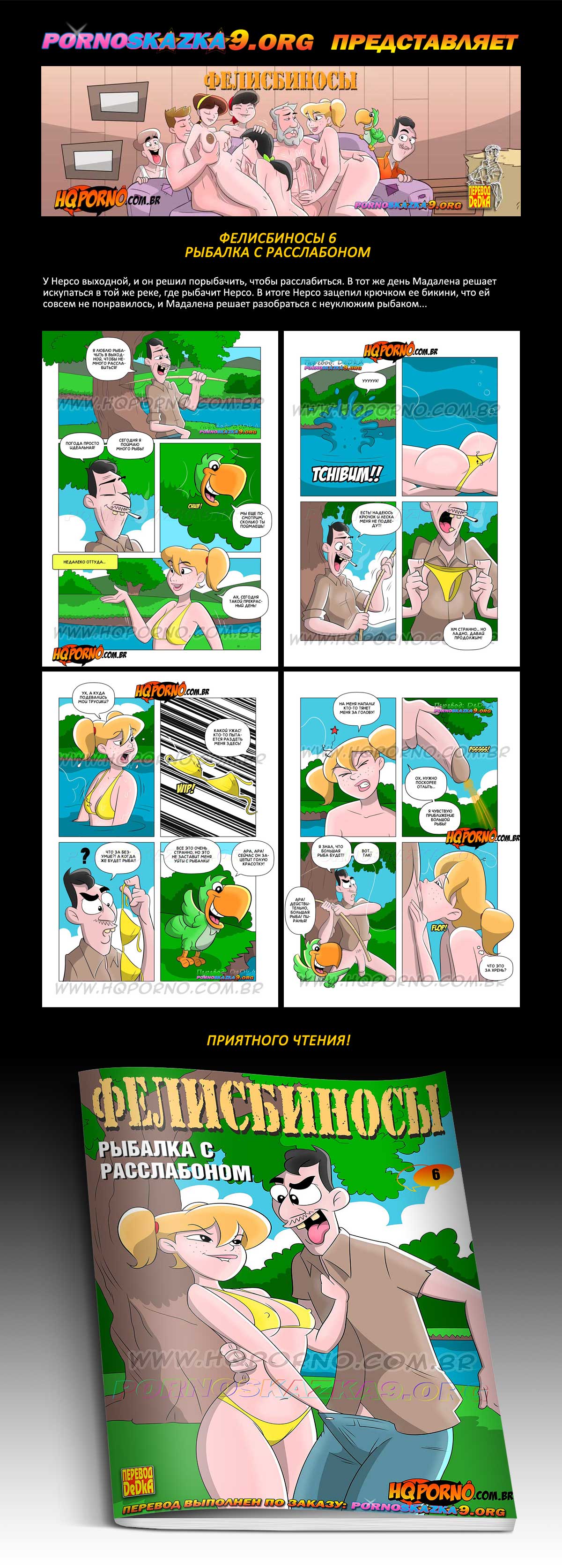Порно комикс «Фелисбиносы. Часть 6. Рыбалка с расслабоном.» У Нерсо выходной, и он решил порыбачить, чтобы расслабиться. В тот же день Мадалена решает искупаться в той же реке, где рыбачит Нерсо. В итоге Нерсо зацепил крючком ее бикини, что ей совсем не понравилось, и Мадалена решает разобраться с неуклюжим рыбаком…